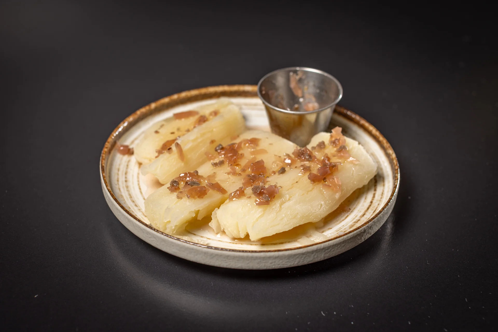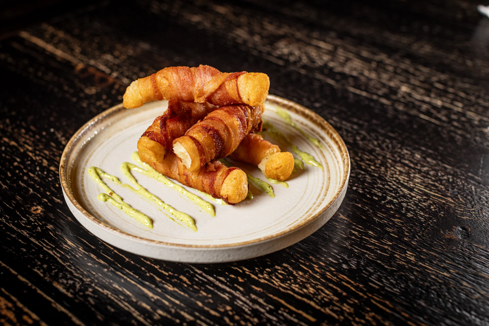 Crispy applewood smoked bacon wrapped cassava, rumba cilantro aioli
