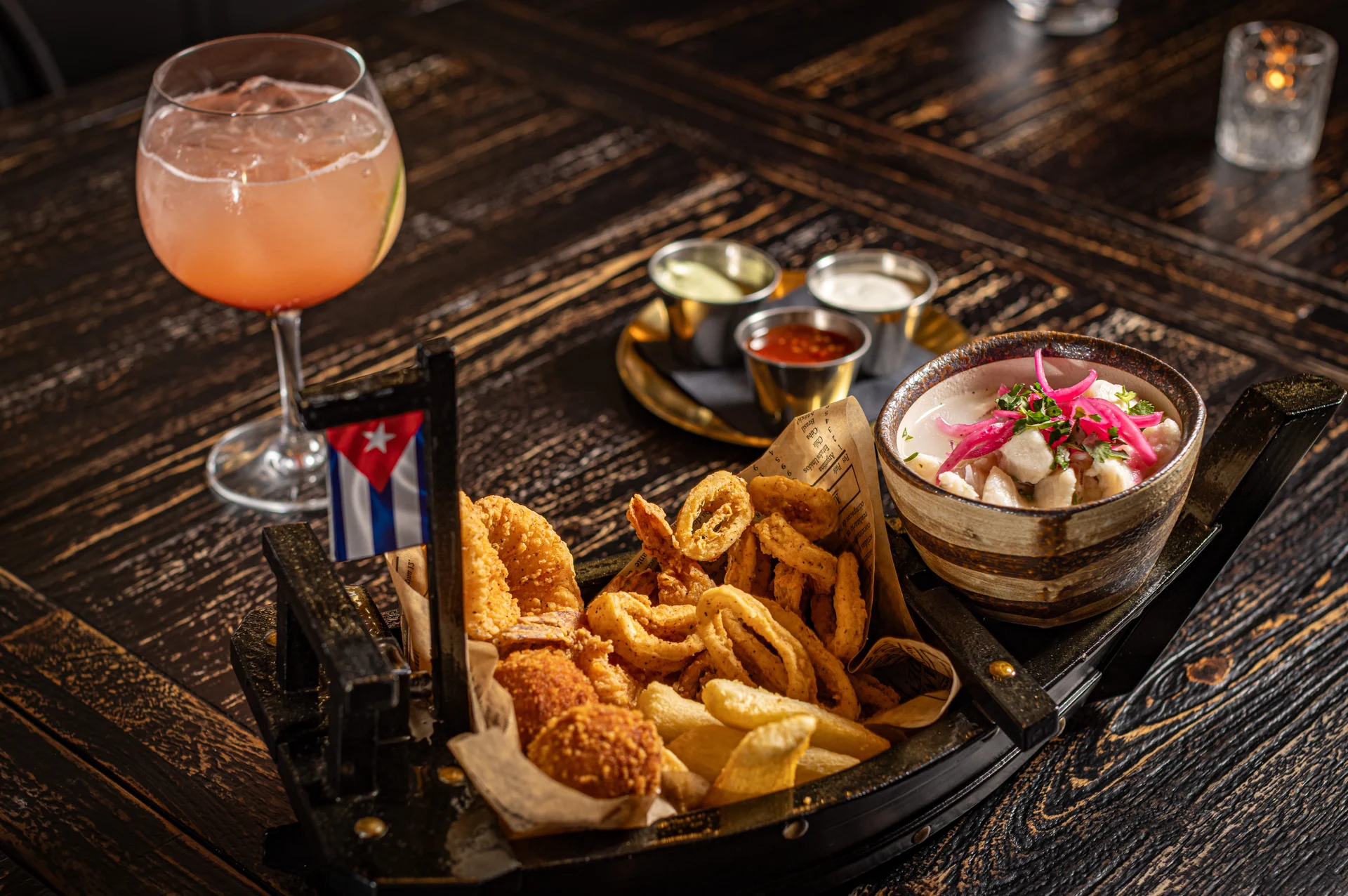 Crispy shrimp, calamari, cod croquettes, fish bites, yuca fries. Choice of ceviche: shrimp or fish