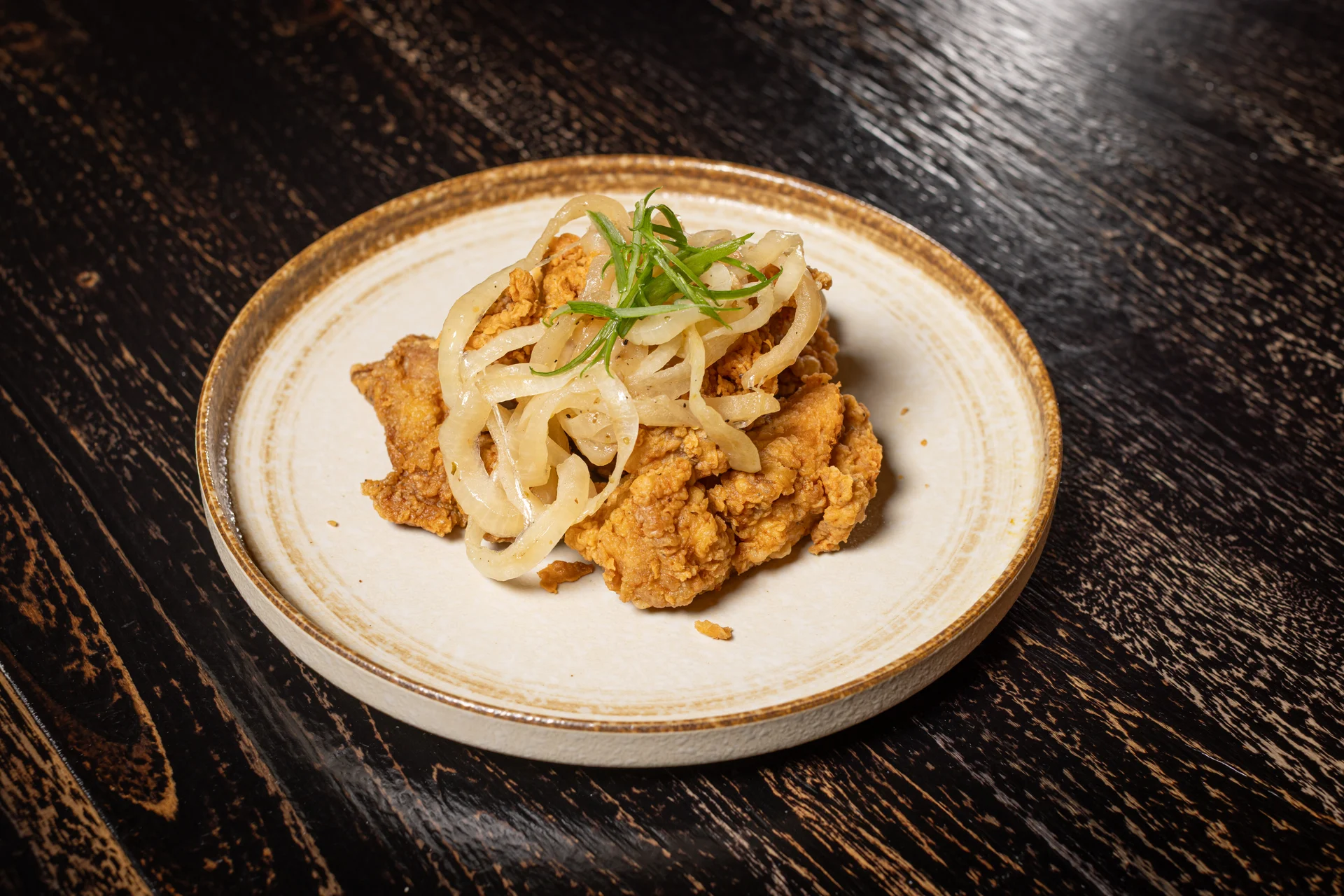 Mojo marinated crispy boneless chicken bites, grilled onions