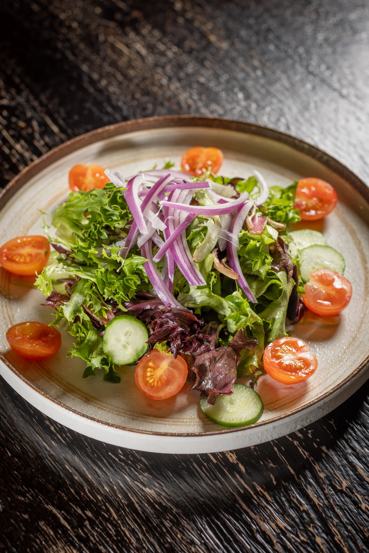Fresh greens, tomatoes, sliced red onions, cucumbers