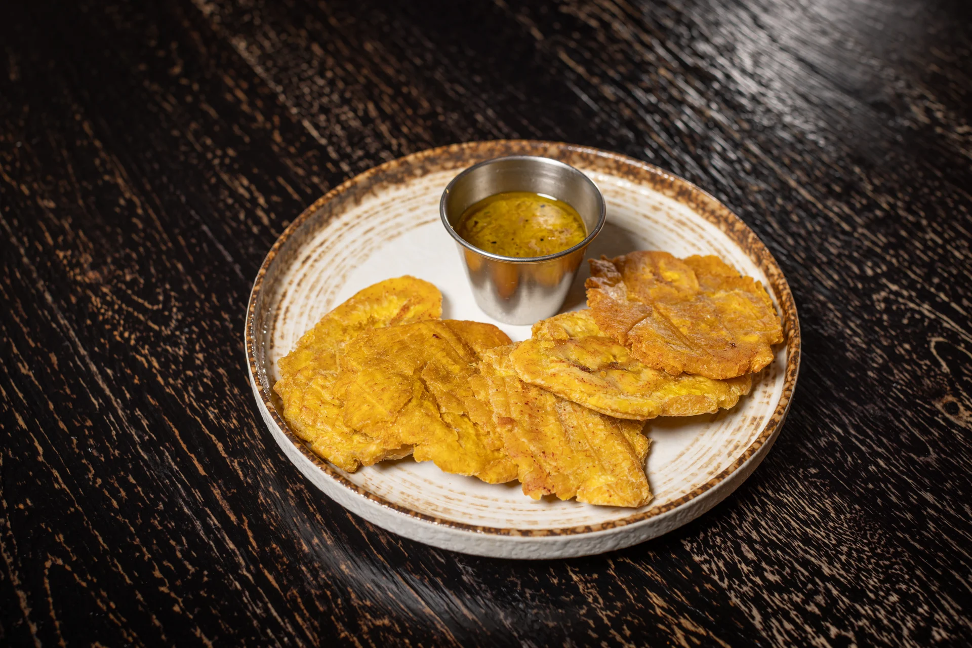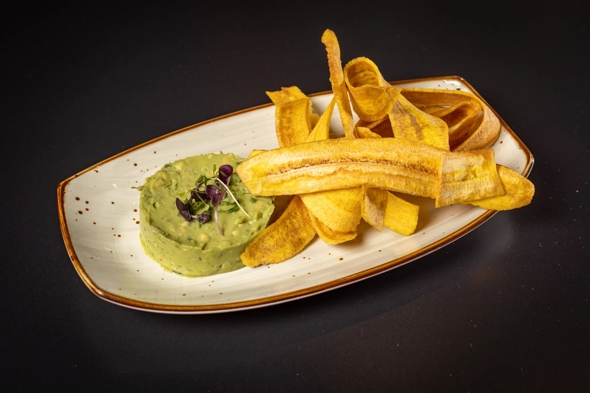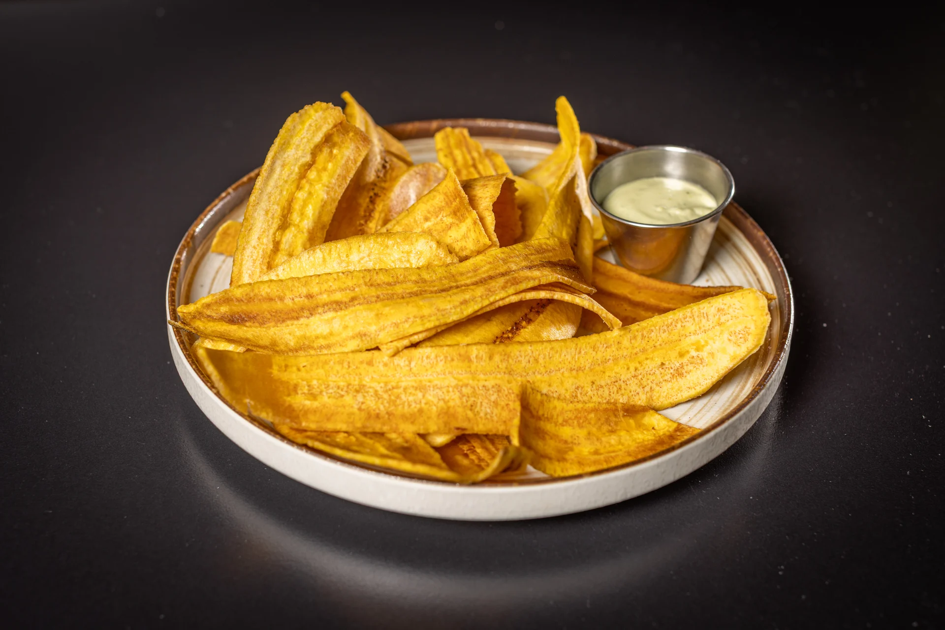Homemade crispy plantain chips, rumba's cilantro aioli