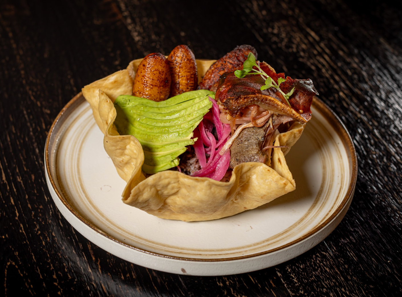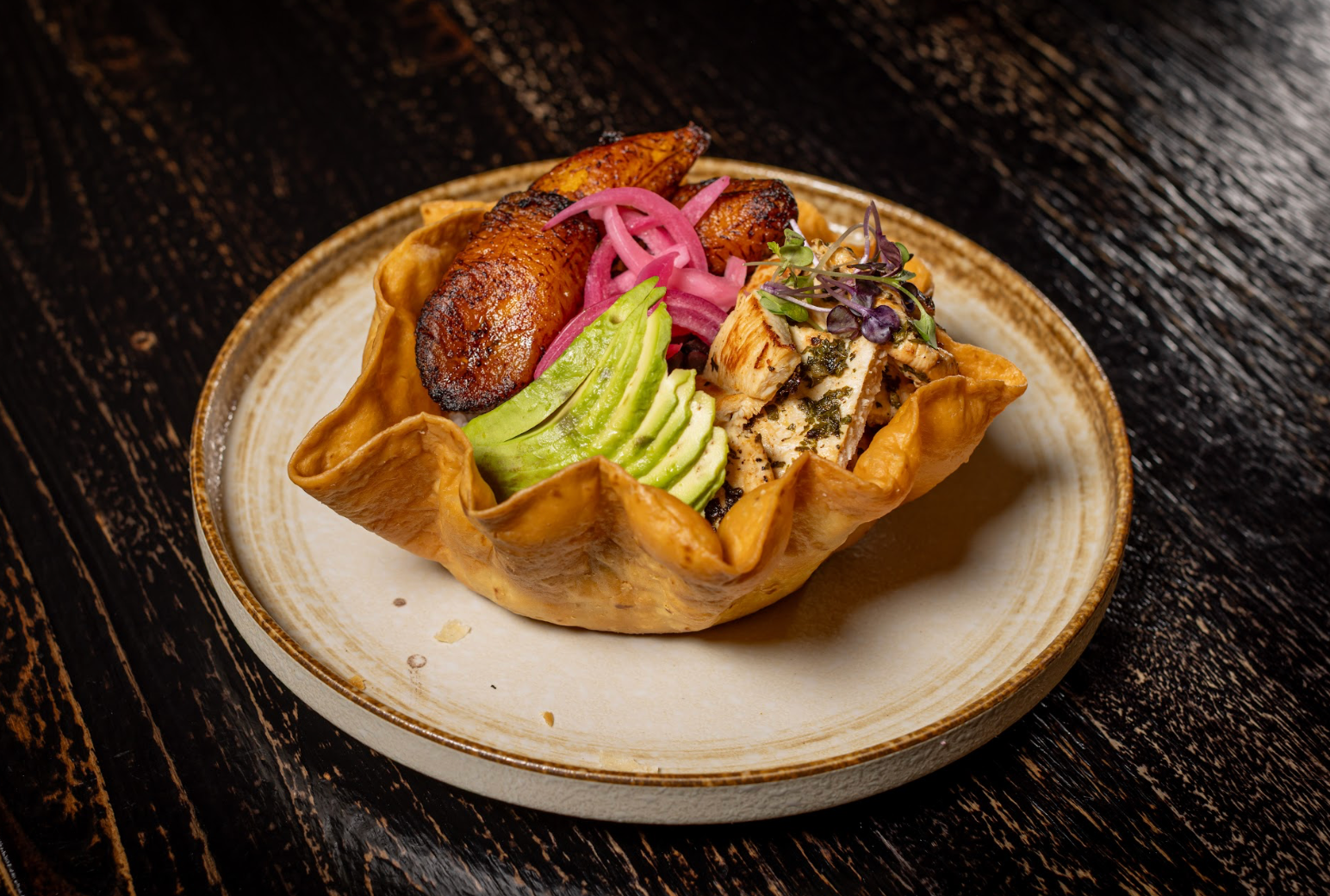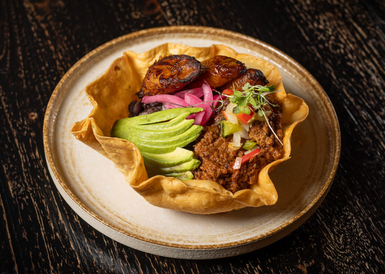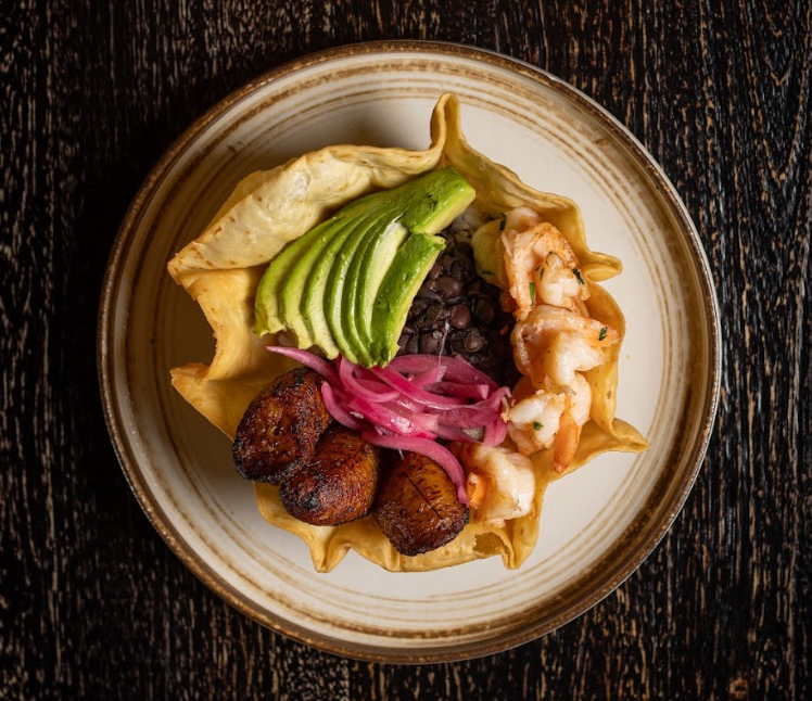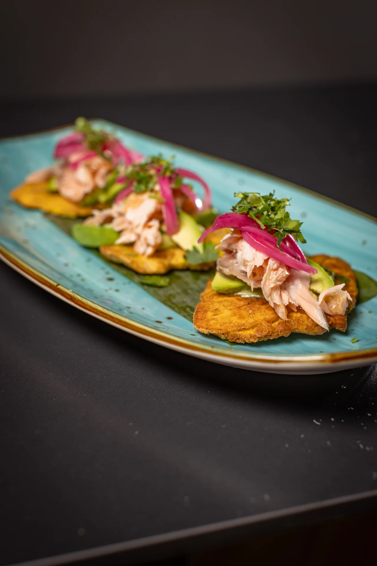 Crispy green plantains tostones topped with churrasco & chimichurri or smoked salmon with avocado, pickle red onions, and cilantro aioli