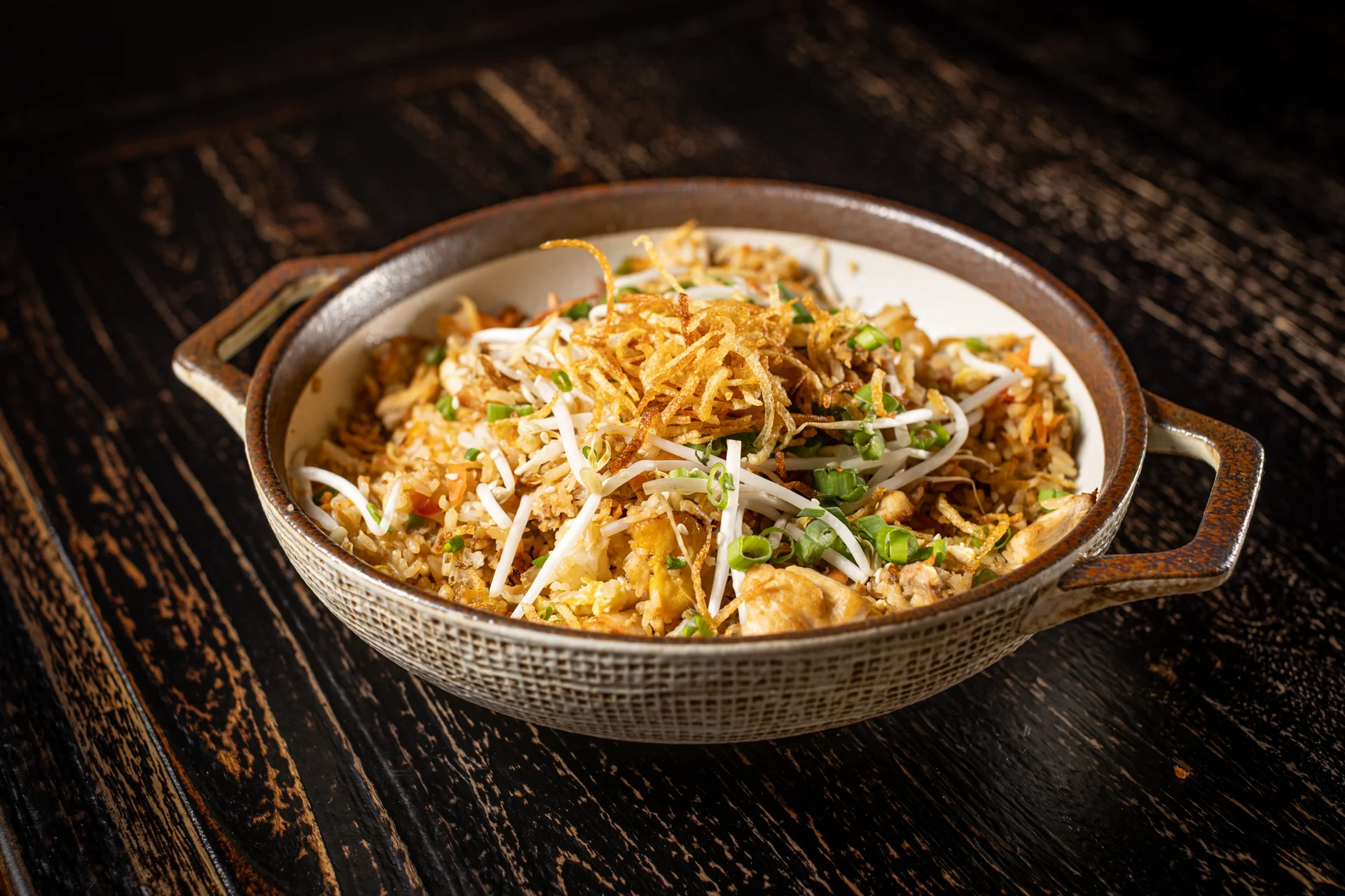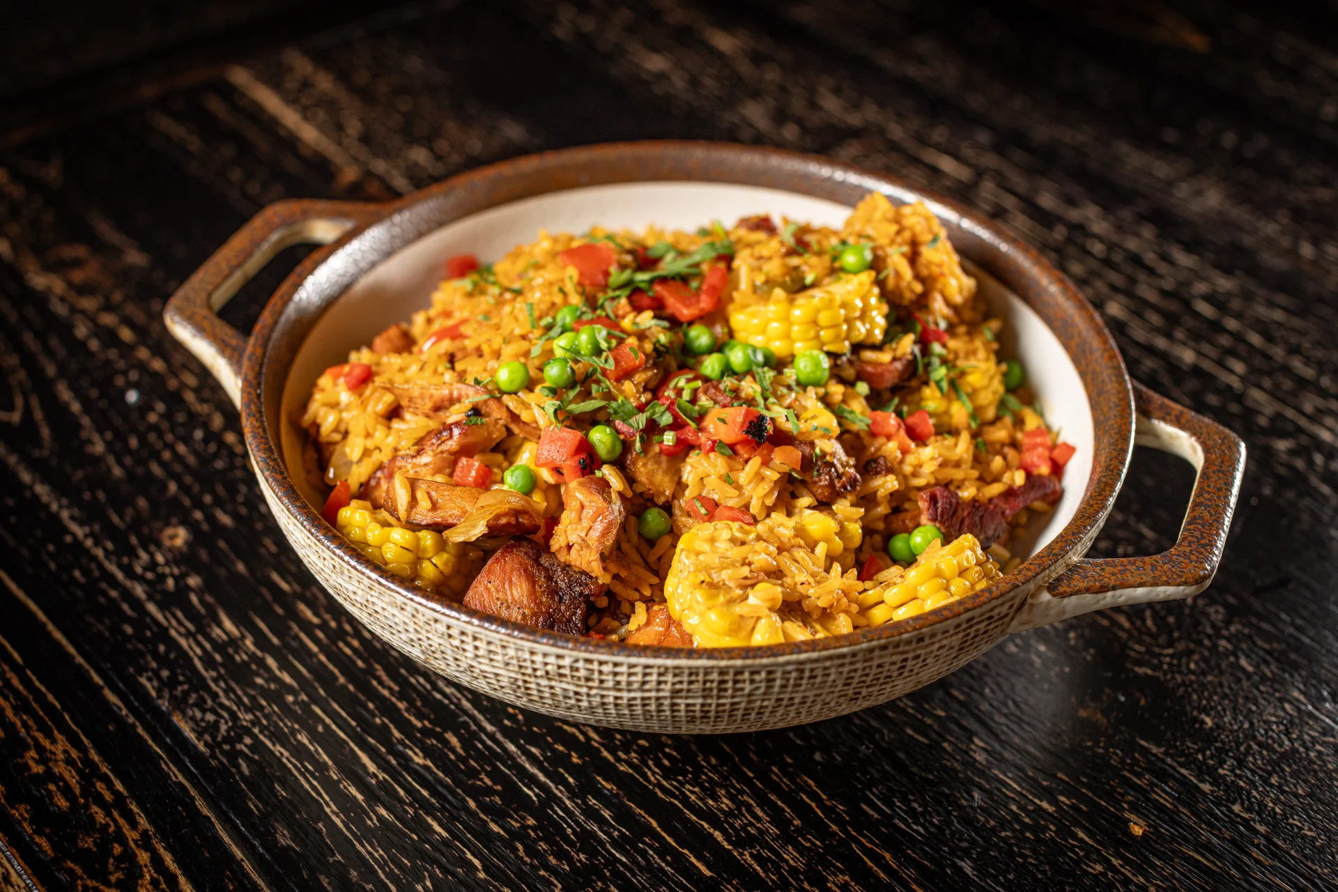 Cuban fried rice, pork, shrimp, chicken, ham, vegetables, sweet plantains, scrambled eggs, sesame seeds