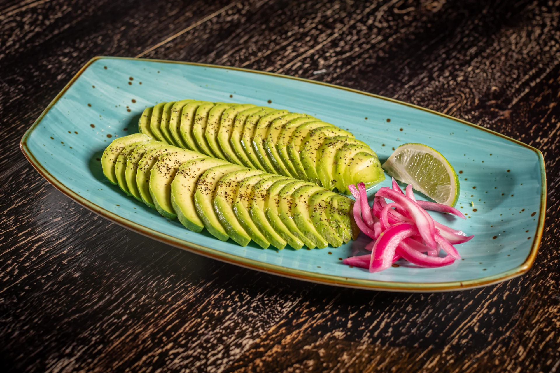 Sliced avocado, pickled red onions, Evoo
