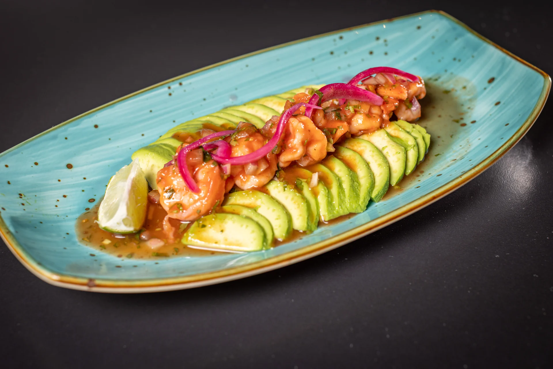 Avocado stuffed with your choice of ceviche: ceviche de pescado (fish ceviche), ceviche de camarones (shrimp ceviche)