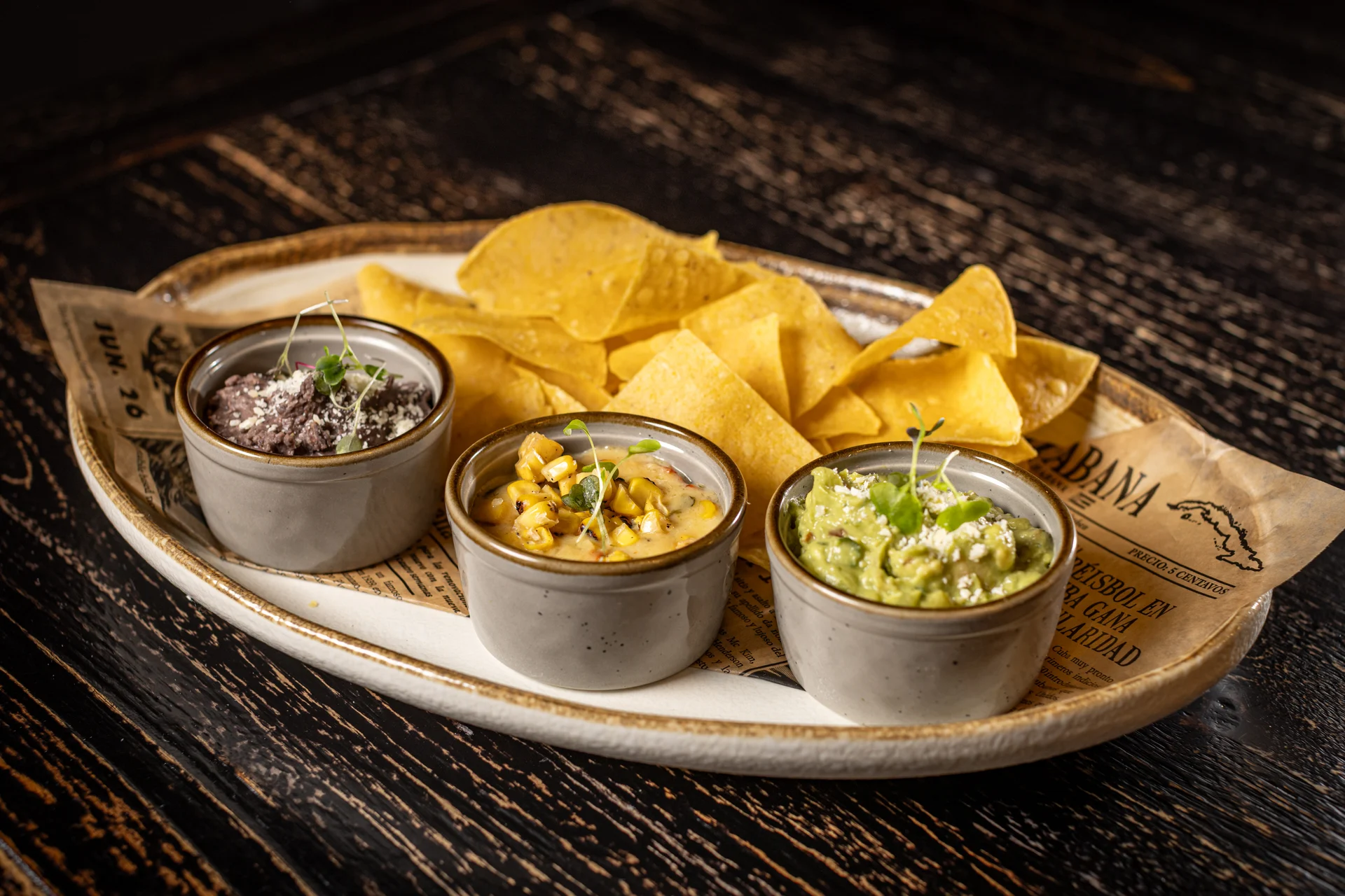 Creamy corn, poblano, cilantro, white cheese, black bean hummus, guacamole, chips