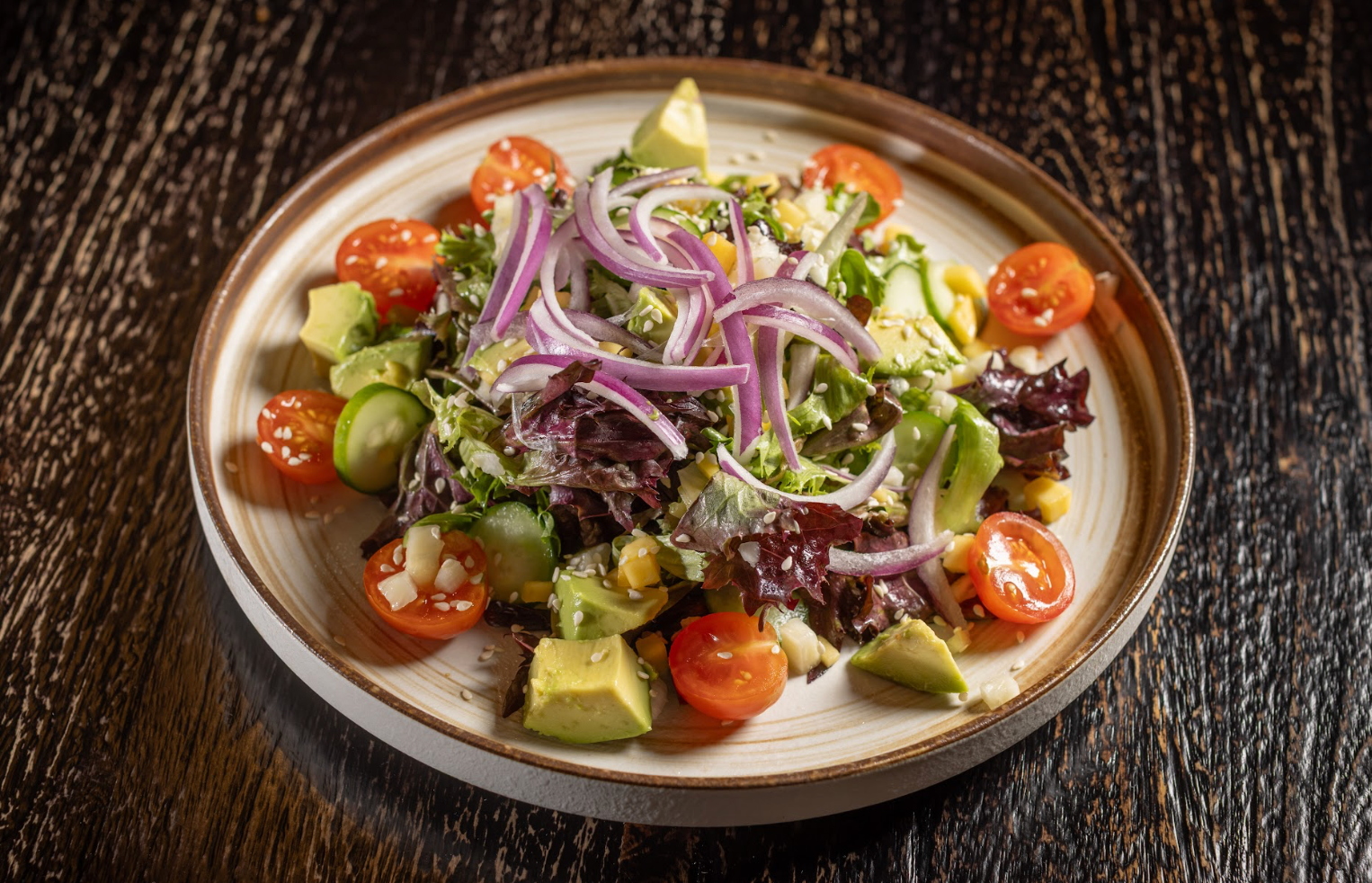 Mixed greens, honey garlic vinaigrette, pineapple, mango, avocado, tomatoes, red onions, sesame seeds