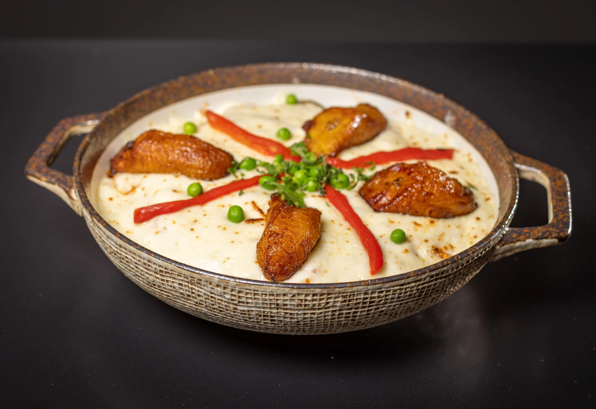 Cuban "Lasagna" rice, chicken, mozzarella cheese, sweet plantains. Add ham (+2)