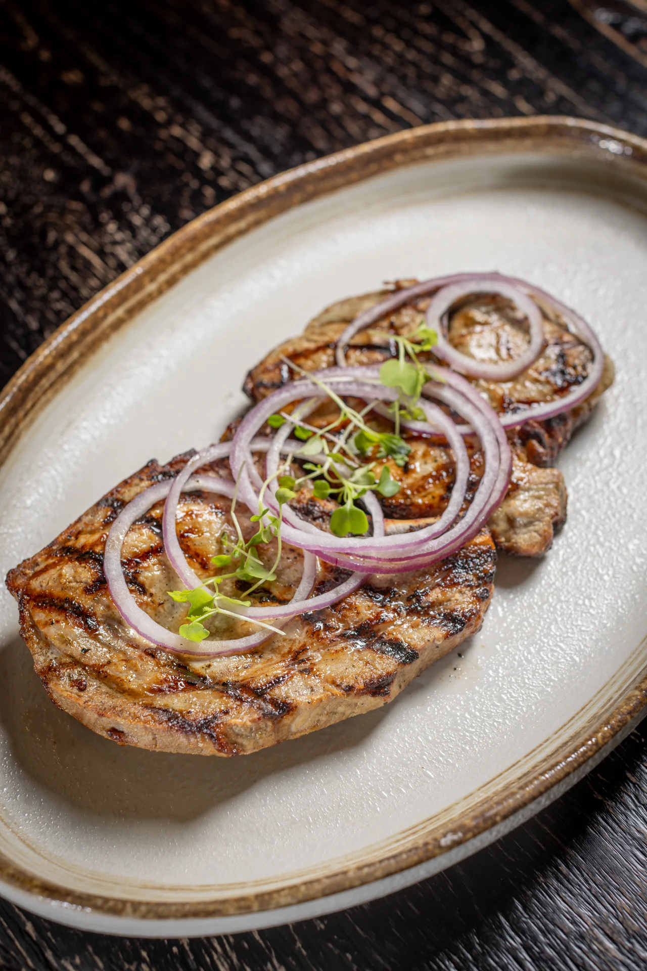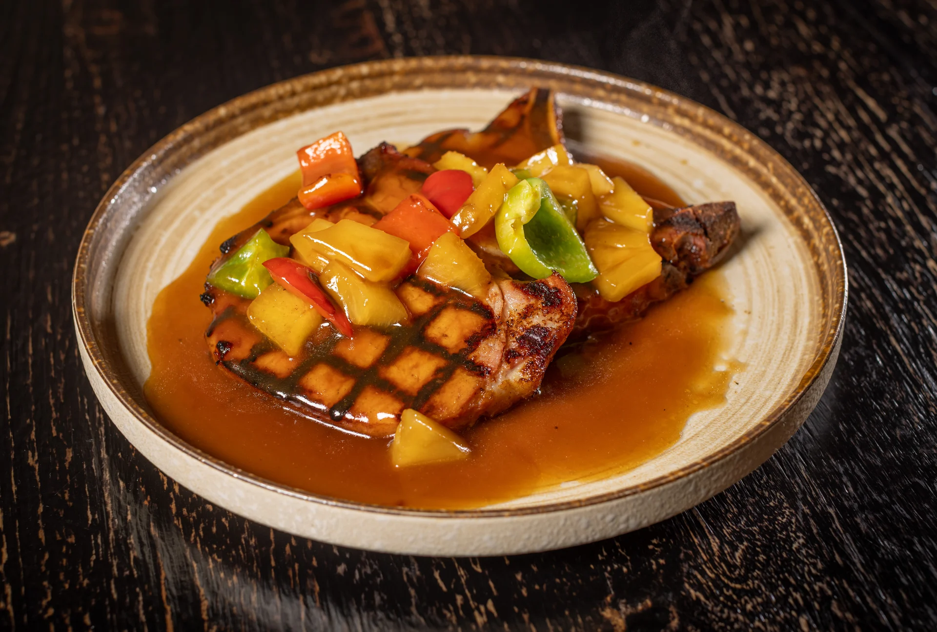 Grilled smoked pork chops, caramelized pineapple