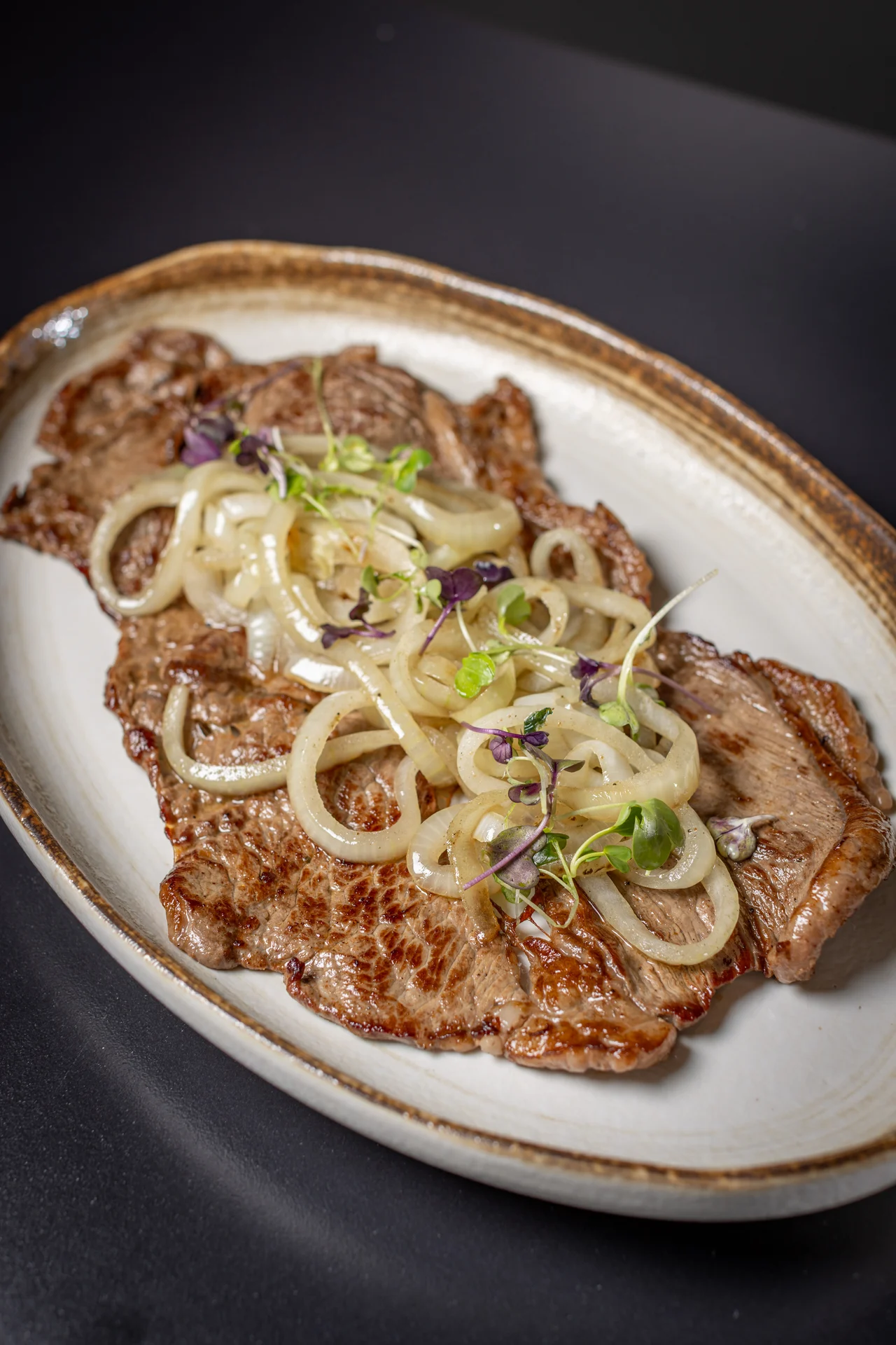Sirloin steak, sour orange, garlic, grilled onions