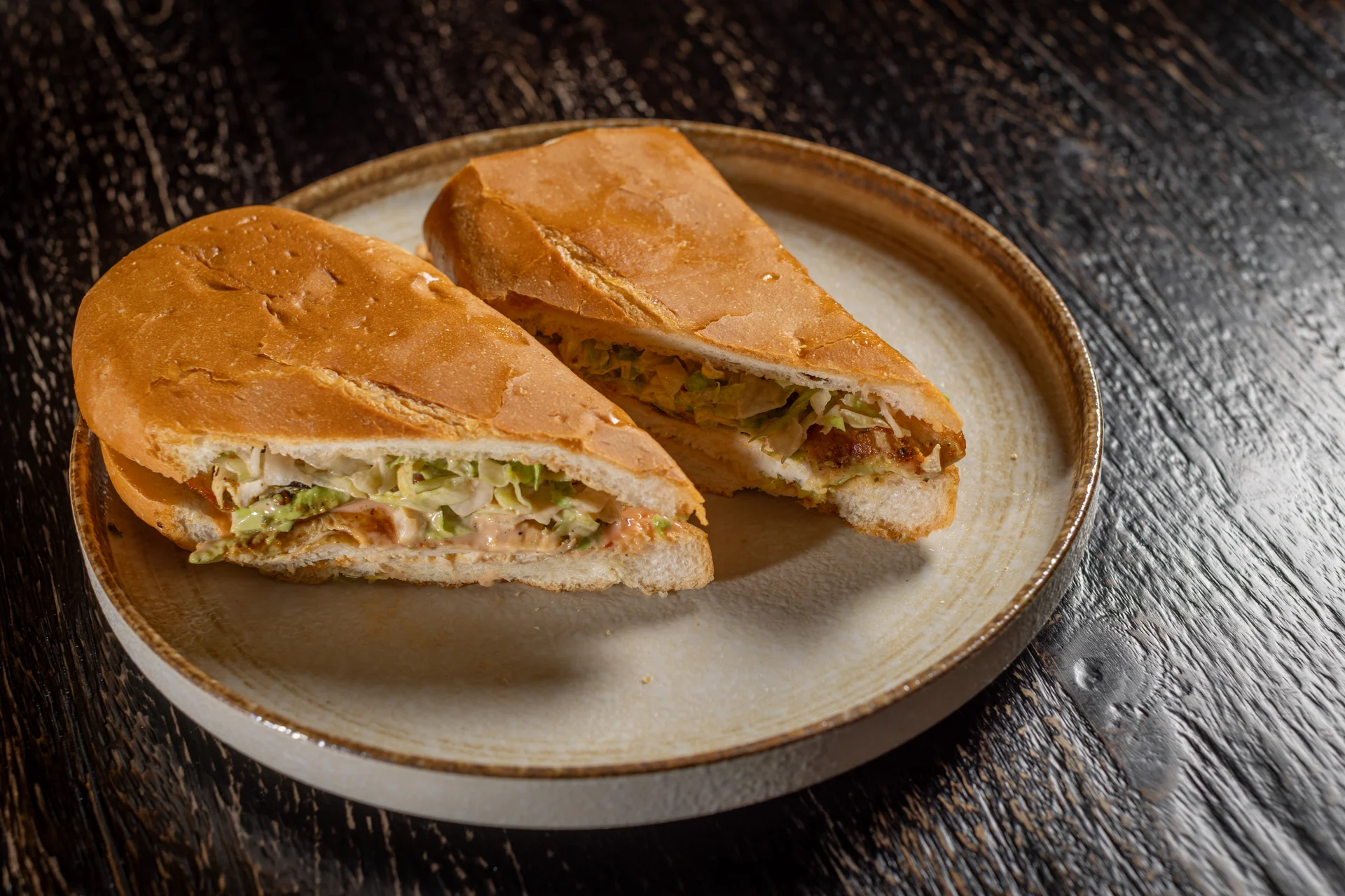 Grilled boneless chicken breast, lettuce, tomatoes, onions, and potatoes sticks, or crispy pressed on fresh Cuban bread
