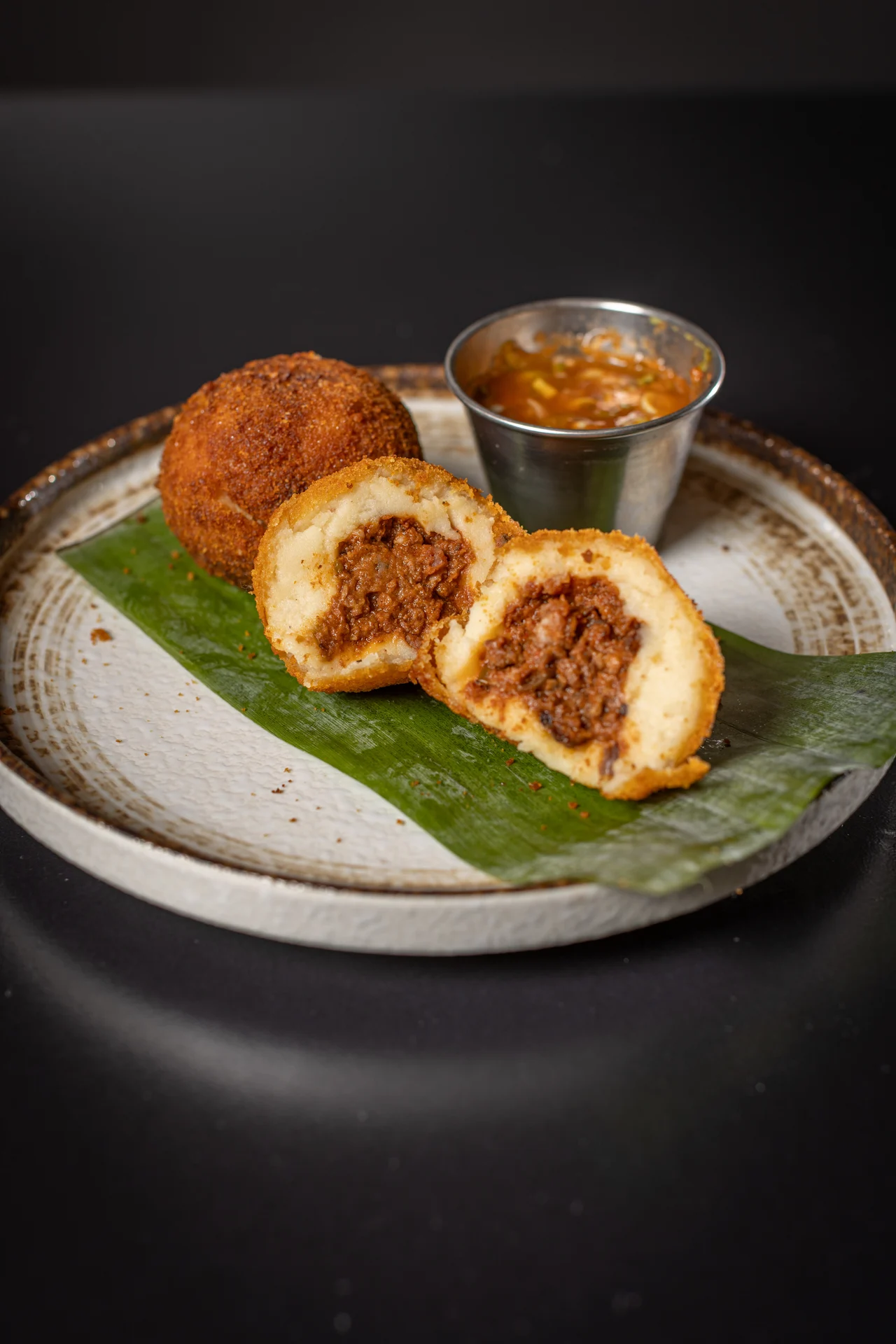 Homemade breaded mashed potato filled with authentic picadillo cubano