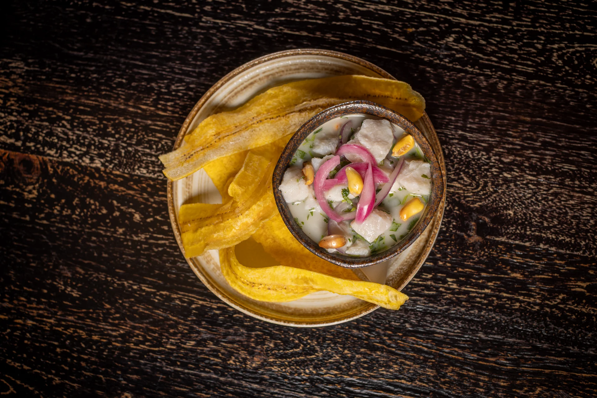 Fish, lime juice, red onions, cilantro, crispy plantain chips