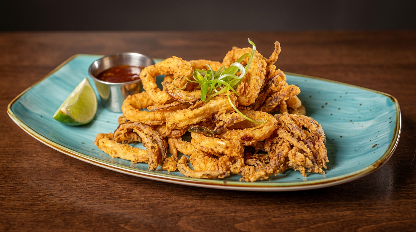 Crispy calamari rings, tentacles, vegetables, sweet chili sauce, lime
