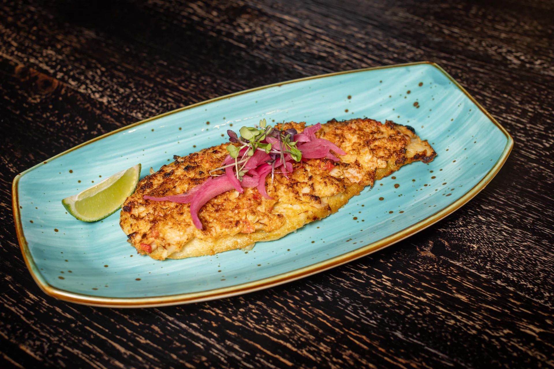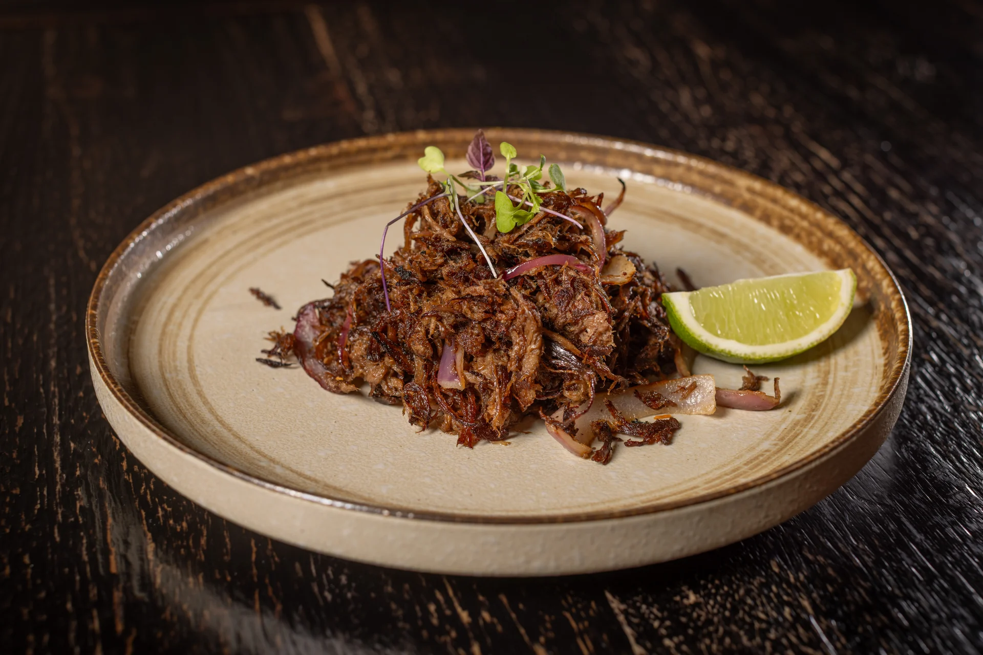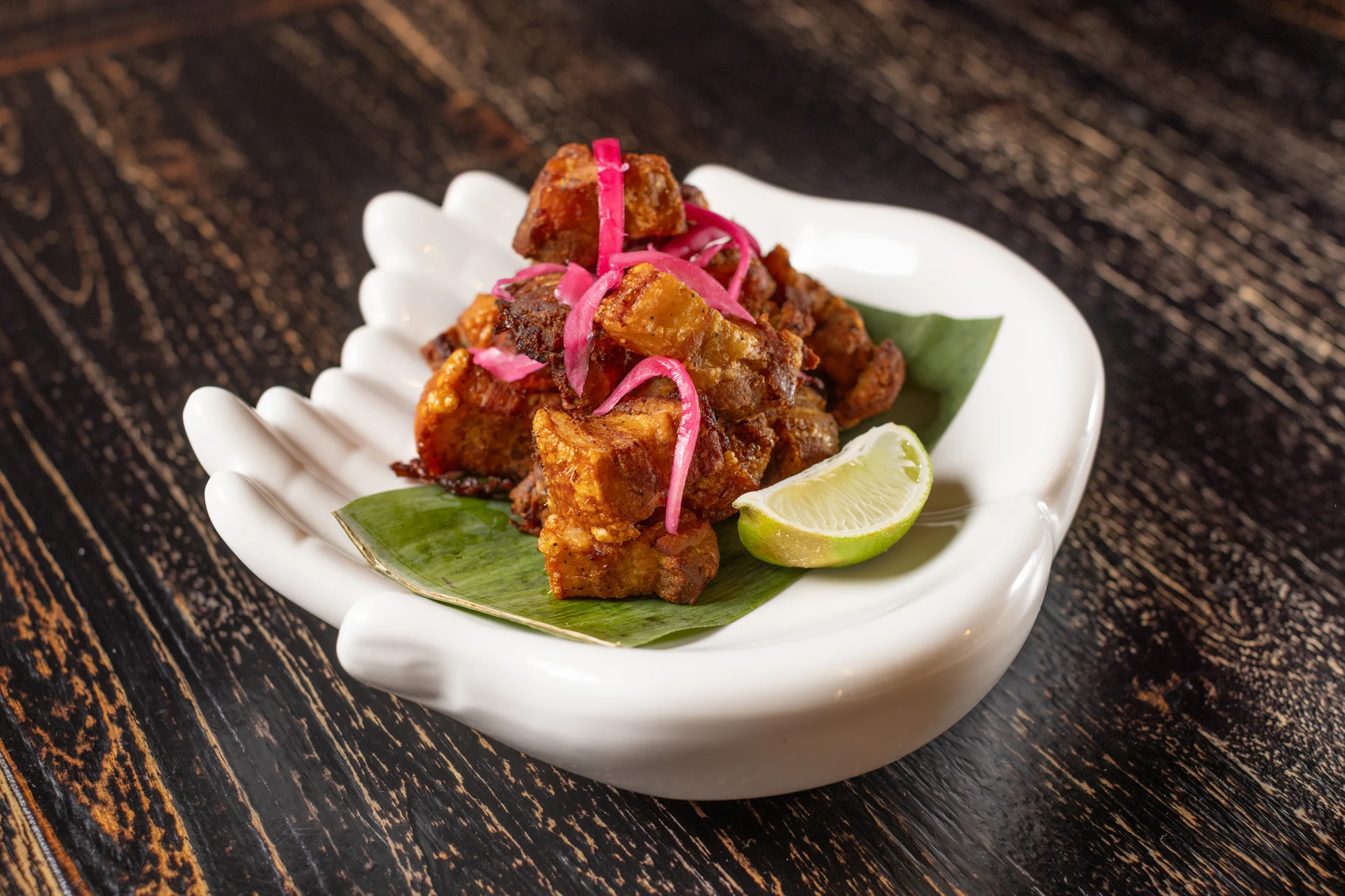 Crunchy pork belly, pickled red onions, lime