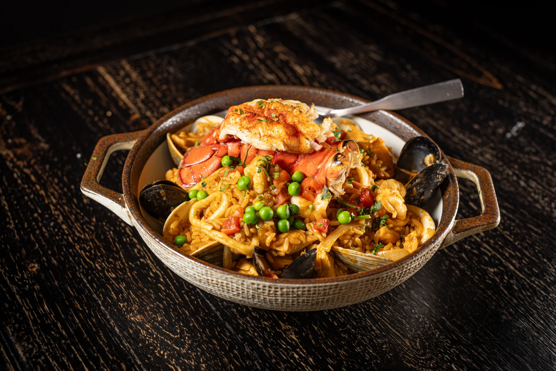 Shrimp, clams, mussels, calamari, chicken, fish, saffron rice. Add loster tail (+10)