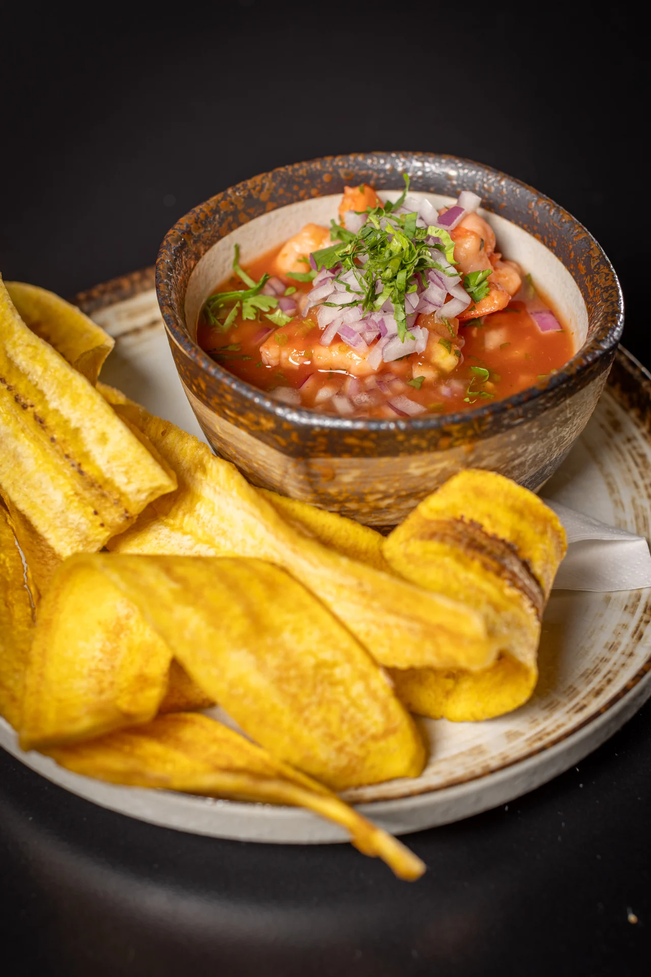 Shrimp, lime juice, tomato, onions, cilantro, crispy plantain chips