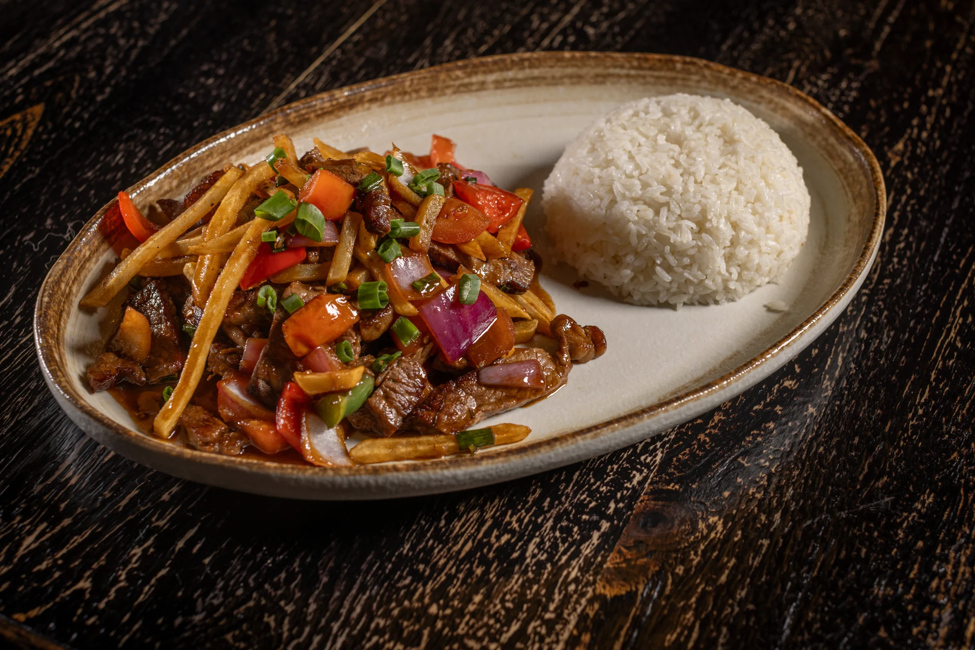 Pan fried sliced steak, garlic, soy sauce, red onions, tomatoes, cilantro, french fries