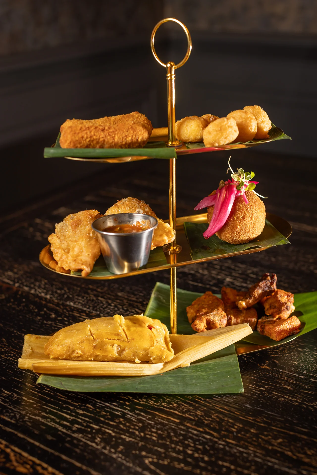 Ham croquettes, corn tamale, beef empanada, corn fritters, crispy pork belly, beef stuffed potato, rumba's homemade hot sauce