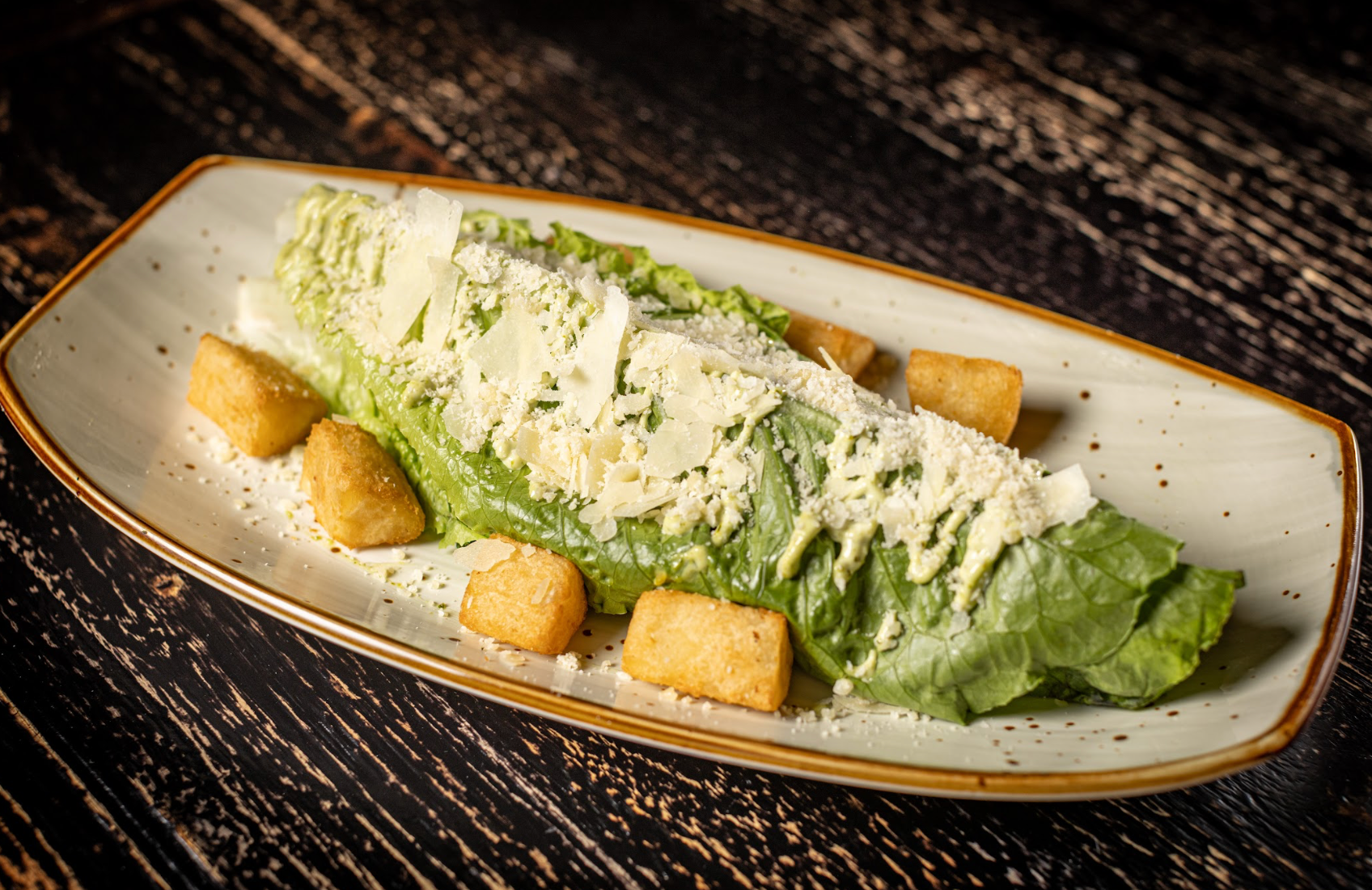 Hearts of romaine, kale, crispy yuca croutons, shaved Parmesan cheese, cilantro Caesar dressing