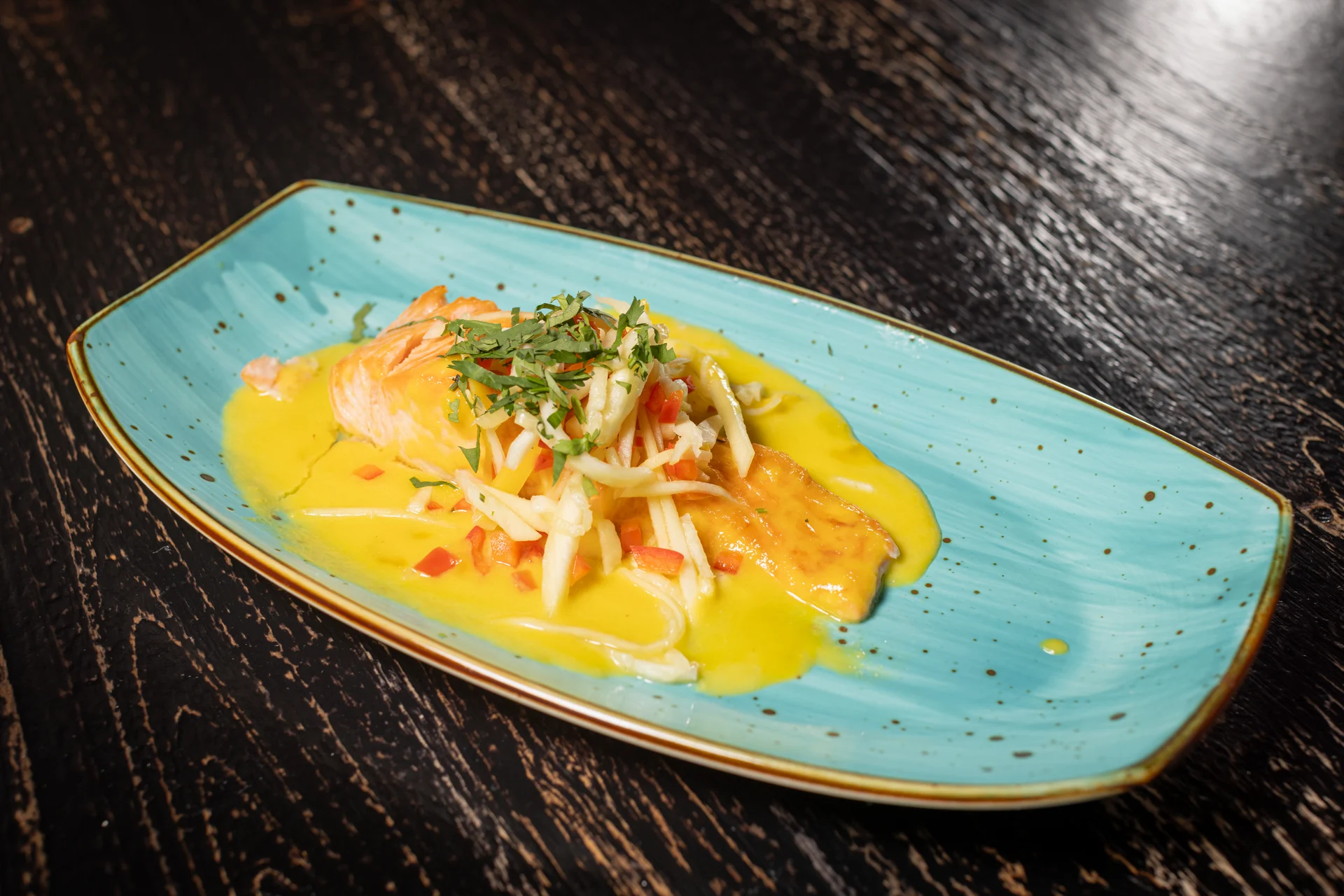 Pan-roasted salmon, mango/pineapple sauce, Pico de Gallo