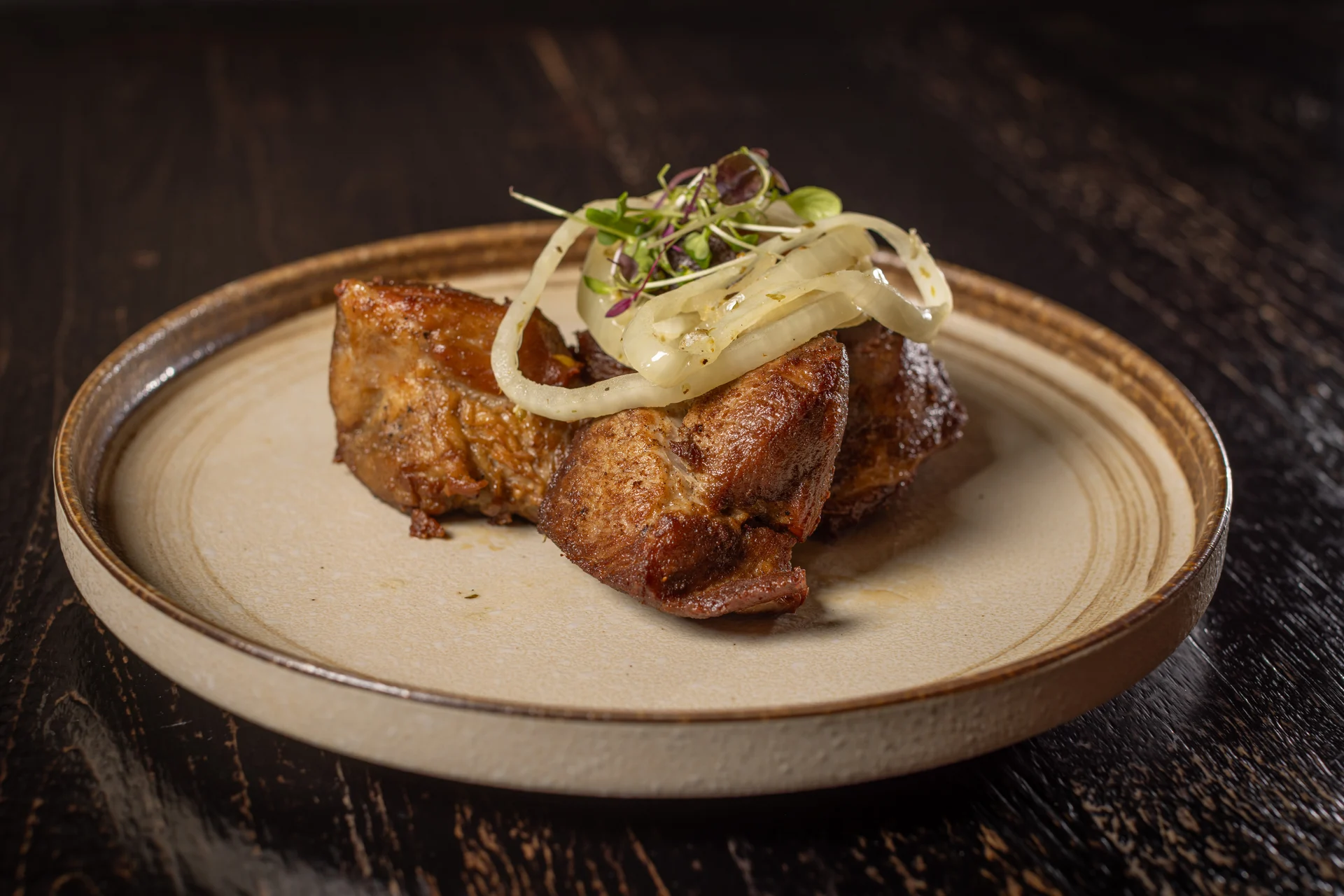 Marinated fried chunks of pork, garlic, mojo, grilled onions